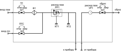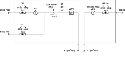 Где:КР1 - кран шаровый Ду15КР2-КР3 - кран шаровый газовый Ду15 1/2”РР1 - стабилизатор расхода газа СРГ-30Ф1 - фильтр поглотительный ФП-6 тумана