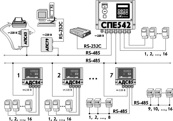 быть подключены от одного до семи расширителей входов - адаптеров АДС84, каждый